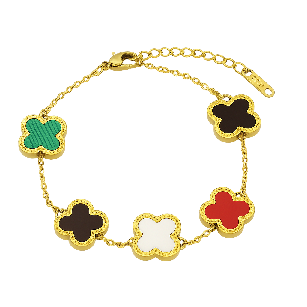 Brățară elegantă cu talismane trifoi în nuanțe vibrante – verde, roșu, alb și maro – perfect conturate în rame aurii strălucitoare. Designul modern și vesel se potrivește oricărei ținute, adăugând un strop de culoare și rafinament. Ideală pentru femeile care iubesc accesoriile distinctive și pline de stil. Un cadou inspirat pentru orice ocazie!