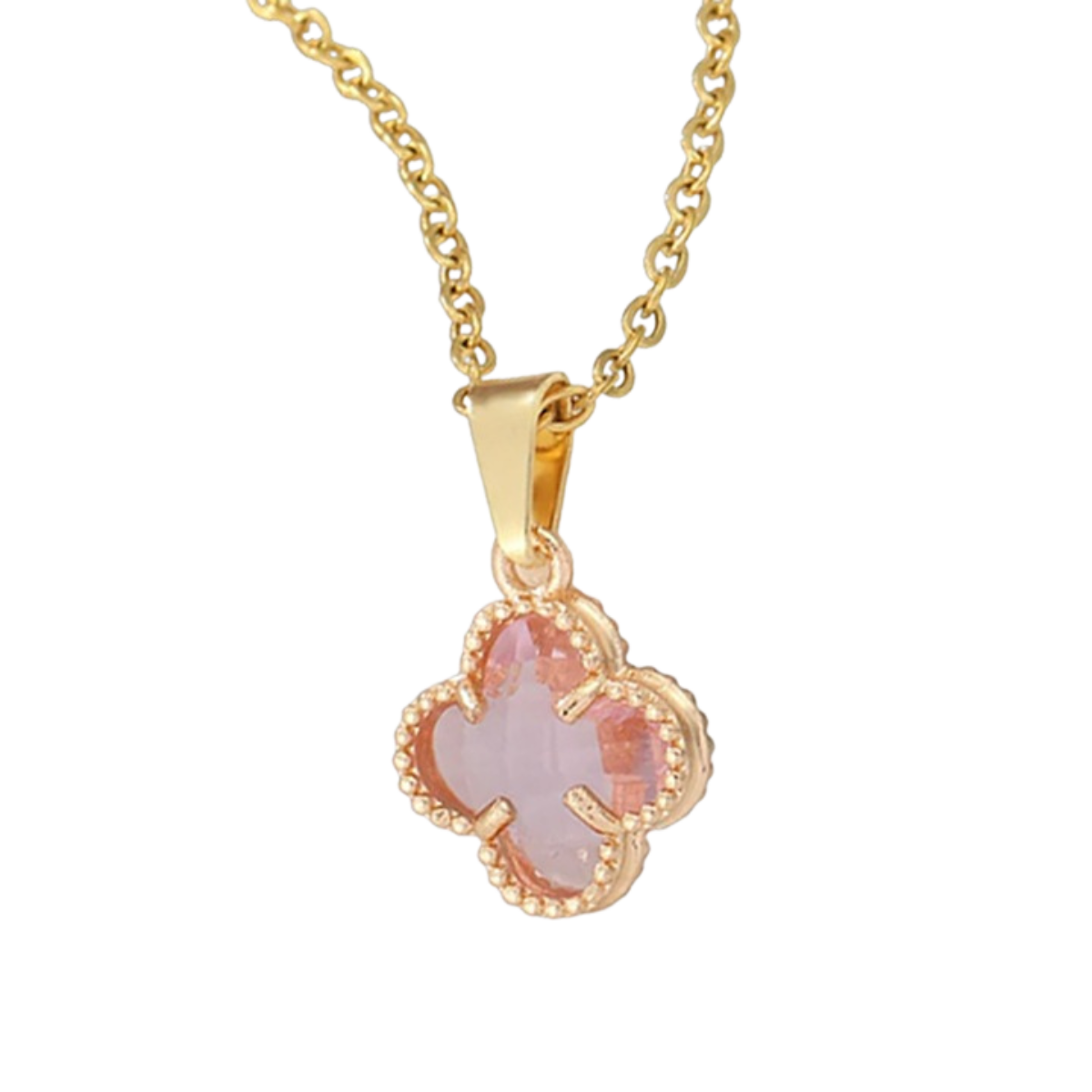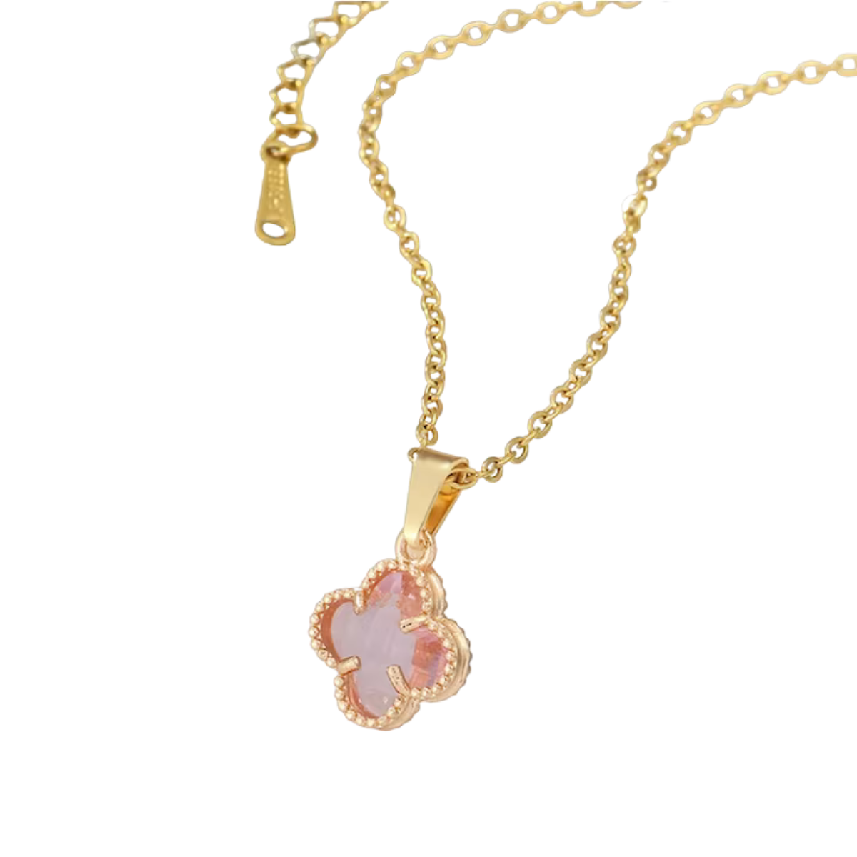 Acest colier elegant este o piesă rafinată, realizată dintr-un lanț fin ce susține un pandantiv în formă de trifoi cu patru foi. Pandantivul este încrustat cu o piatră semiprețioasă roz, cu un finisaj ușor translucid și fațetat, care reflectă delicat lumina. Conturul trifoiului este decorat cu un model fin de granulații aurii, adăugând un plus de textură și eleganță. Designul delicat și feminin îl face perfect pentru purtarea zilnică sau pentru a completa o ținută romantică și sofisticată. Este un simbol al norocului și al frumuseții discrete.