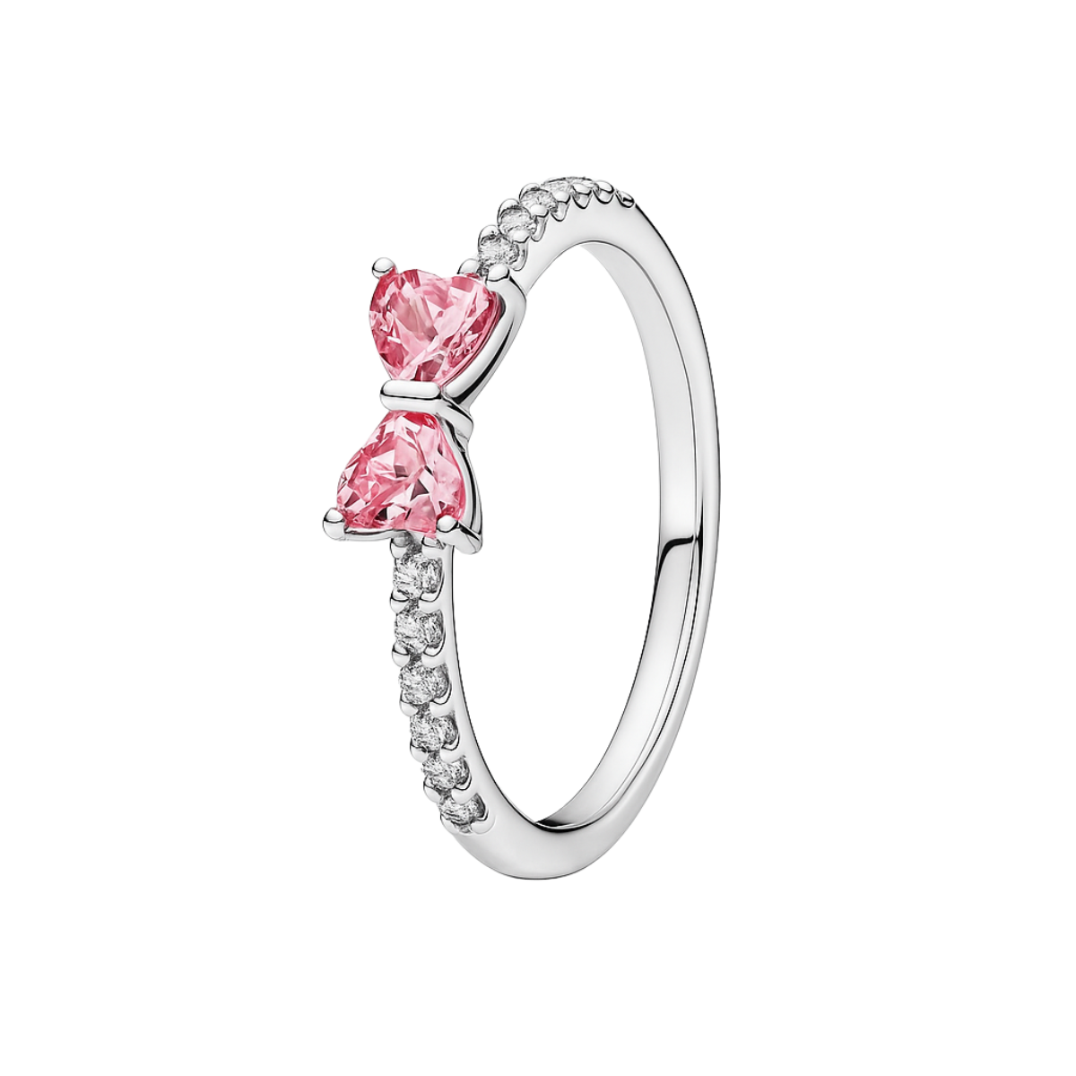 Faceți cunoștință cu inelul cu fundă roz strălucitoare: o bijuterie elegantă. Acest inel versatil include două aplicații din zirconiu cubic roz în formă de inimă ca piesă centrală, cu un motiv delicat de fundă care simbolizează lumina și festivitatea. Banda este decorată cu 14 aplicații de mărgele rotunde din zirconiu cubic transparent în formă de diamant pentru un plus de strălucire. Perfect pentru a fi purtat cu ținute casual și formale, acest inel aduce o pată de culoare oricărui look.